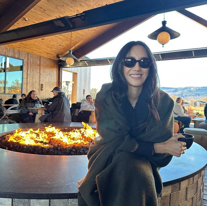 베이지 톤의 니트 가디건으로 포근하고 편안한 분위기를 연출하고 있다. 오버사이즈 핏의 니트웨어는 캐주얼하면서도 여성스러운 실루엣을 만들어내며, 선글라스와 함께 카페에서의 여유로운 일상 패션을 완성하고 있다.