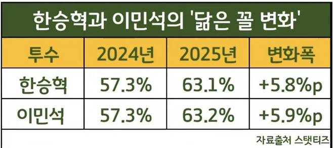 확실한 변화입니다. 위력적인 구위를 가지고 있던 투수가 리그 평균보다 훨씬 낮은 비율로 스트라이크를 던지다가 이제 평균 수준으로 스트라이크를 던지기 시작한 겁니다. (기록통계 사이트 스탯티즈에 따르면 2025시즌 리그 전체 투구 중 스트라이크의 비율은 63.3%로 한승혁 선수는 이제 딱 리그 평균 수준으로 스트라이크를 던지기 시작했습니다.)