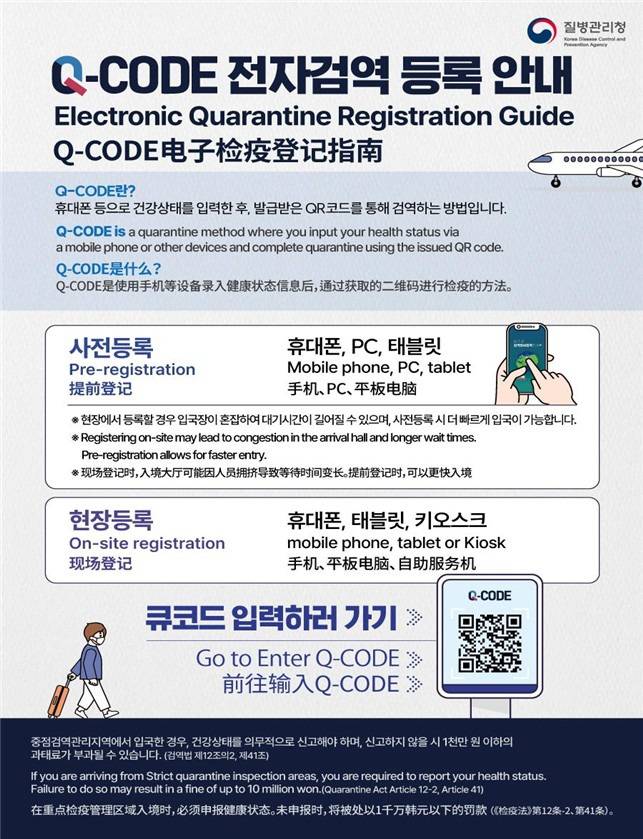 질병청은 이와 함께 이달 15일부터 Q-CODE(큐코드·검역정보 사전입력시스템) 기반 전자검역 시범사업 지역도 기존 김해·대구·청주공항에서 김포·제주공항까지로 확대한다.