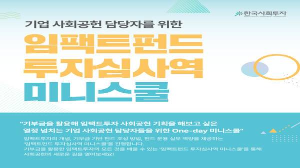 공익법인 임팩트투자사 한국사회투자는 기업 사회공헌 담당자를 위한 ‘임팩트펀드 투자심사역 미니스쿨’을 개최한다. 사회공헌 담당자 대상 맞춤형 교육을 통해 임팩트투자에 대한 인식을 높이고, 이들의 사회공헌 프로그램 기획 역량 강화를 지원한다는 계획이다.