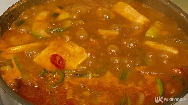 여기에 물 1L를 붓고 끓인다. 국물이 끓어오르면 감자 2개, 양파 1개, 애호박 1/2개, 두부 1/2모를 넣는다. 재료가 충분히 익을 때까지 중불에서 뭉근히 끓여준다. 마지막 단계에서 식초 1스푼과 후추를 넉넉히 넣어 맛을 조절하면 깔끔한 마무리가 된다.