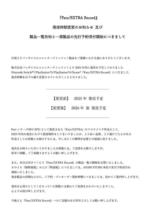 반다이남코 엔터테인먼트는 오늘(22일), 공식 홈페이지와 SNS를 통해 '페이트/엑스트라 레코드'의 출시 연기 소식을 전했다. 반다이남코 엔터테인먼트는 당초 '페이트/엑스트라 레코드'는 올해 중으로 출시 예정이었으나, 퀄리티 및 플레이 경험 향상을 위해 이와 같은 결정을 내렸다고 밝혔다.