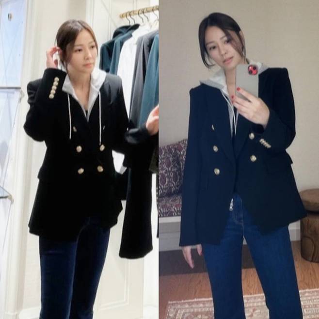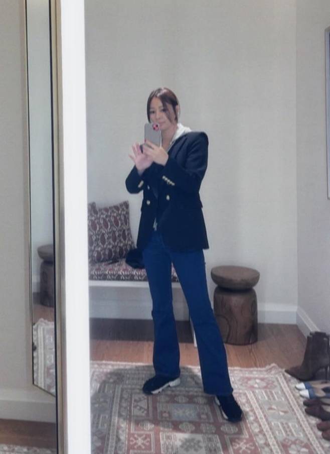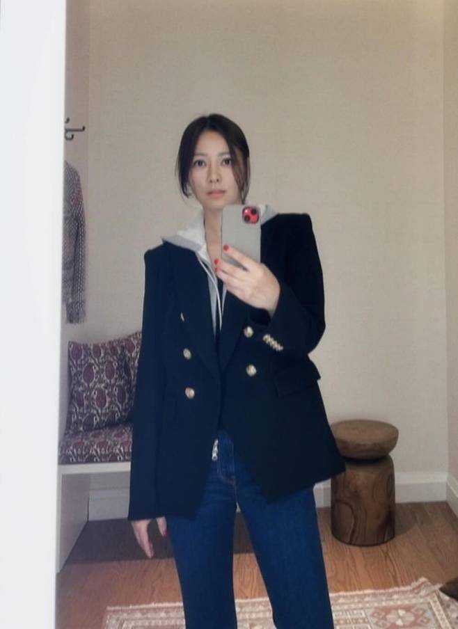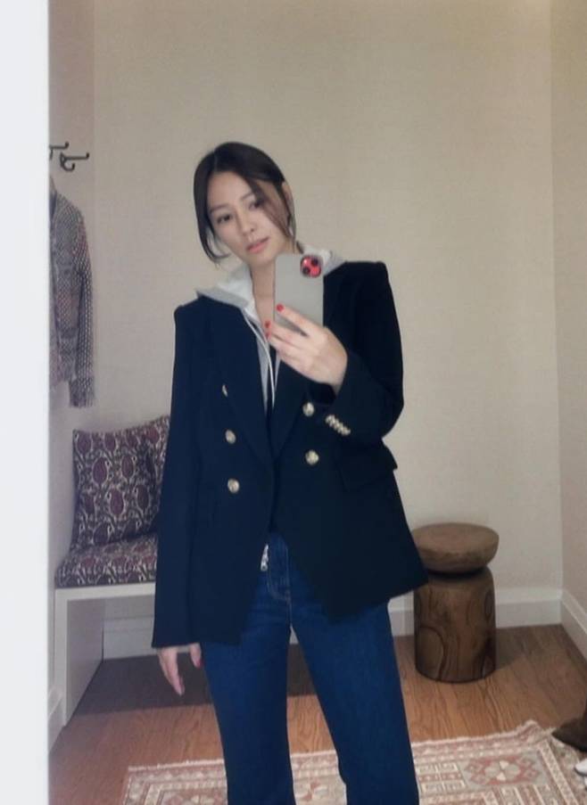 공개한 사진에서 손태영은 후드 스웻셔츠에 블레이저 재킷을 입고 데님 팬츠를 매치한 스타일로 대학생 여친 같은 가을룩을 완성했다.