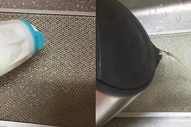 일단 싱크대 배수구 구멍에 비닐봉지를 끼워 물이 안 빠지게 해 주시고요. 더러운 가스후드에 베이킹소다를 넉넉히 뿌리세요. 그다음 팔팔 끓인 뜨거운 물을 천천히 부어줍니다.