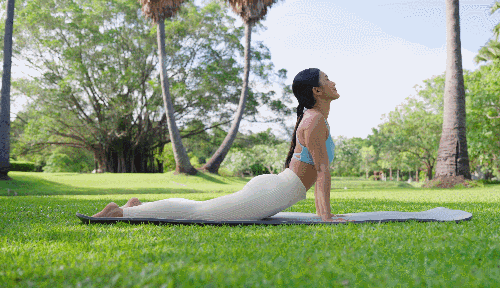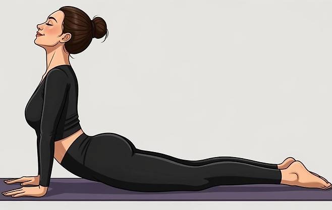 매트에 엎드려 상체를 곧게 펴고 두 다리는 가지런히 모아줍니다. 손바닥은 어깨 옆 바닥에 두고, 팔꿈치를 펴면서 상체를 천천히 들어 올리세요. 허리는 과도하게 꺾지 말고 가슴을 활짝 열어 시선은 정면이나 천장을 바라봅니다.