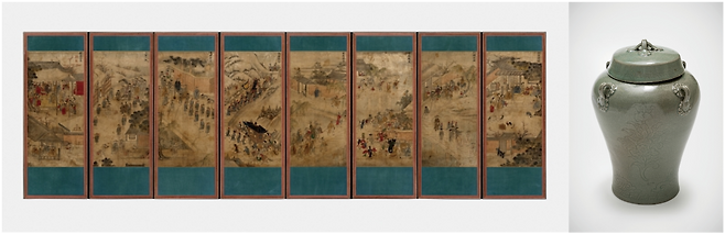 첫 기념품은 ‘평생도 8폭 병풍’입니다. 19세기 말 가로 3.6m, 세로 1m 크기로 제작된 병풍은 사람이 태어나서 죽을 때까지 기념될 만한 일들을 골라 그린 풍속화를 품고 있습니다. 각 폭에는 돌잔치, 혼례, 과거급제, 벼슬길, 관찰사 부임, 판서 행차, 정승 행차, 회혼식 등 각 삶의 전환점이 될 만한 순간이 그려져 있습니다.
