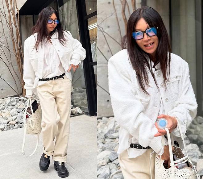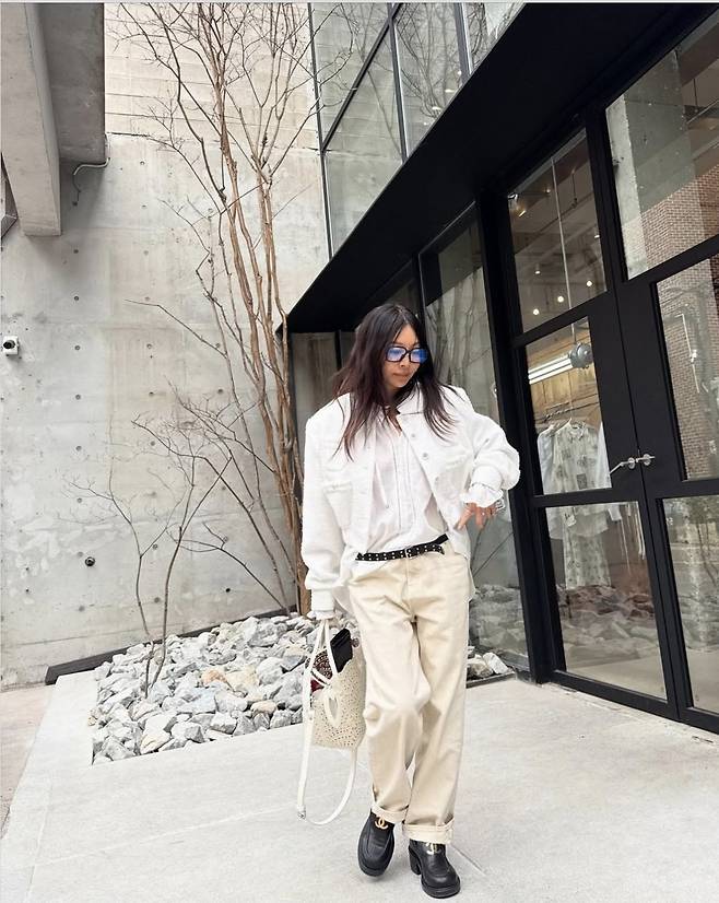 황신혜는 화이트 셔츠에 포근한 텍스처의 크롭 아우터를 레이어드하고, 여유 있는 핏의 아이보리 팬츠를 매치해 시크하면서도 편안한 감성의 데일리룩을 선보였습니다.
