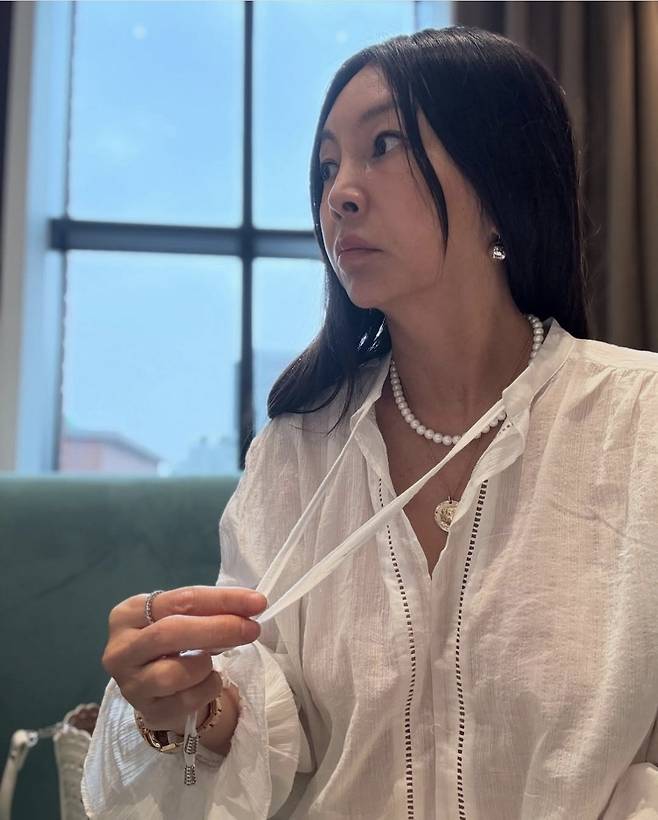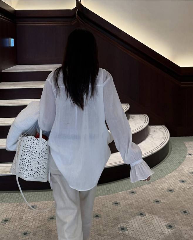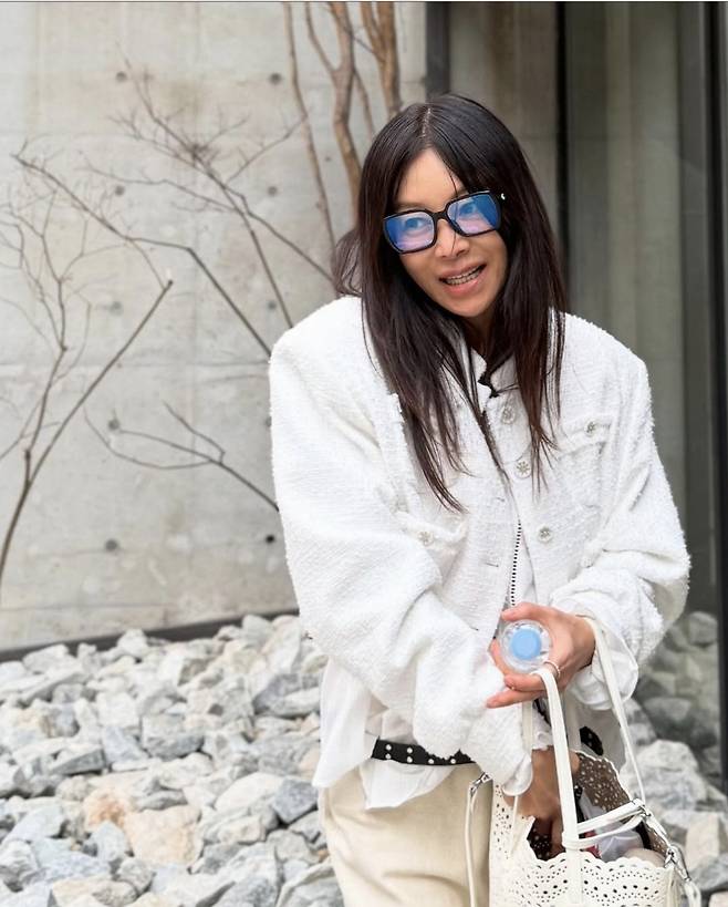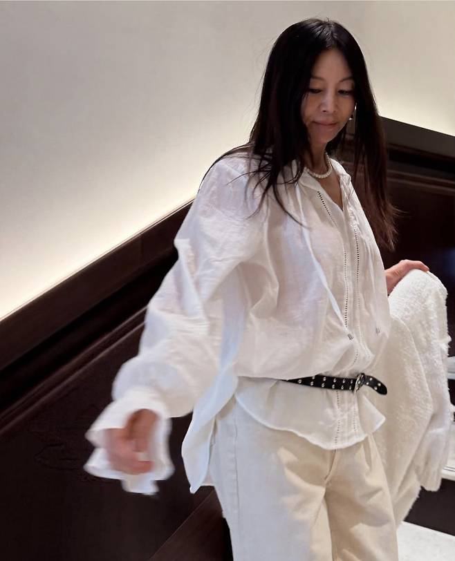 에코백 대신 선택한 구조적인 디자인의 아이보리 백은 꾸안꾸 무드를 극대화하며, 황신혜 특유의 시원한 분위기를 배가시켰습니다.