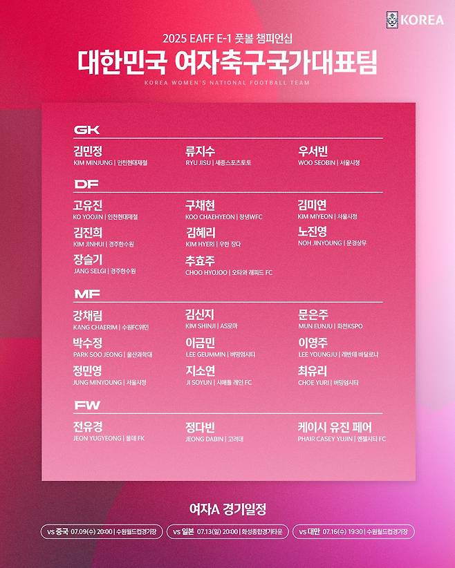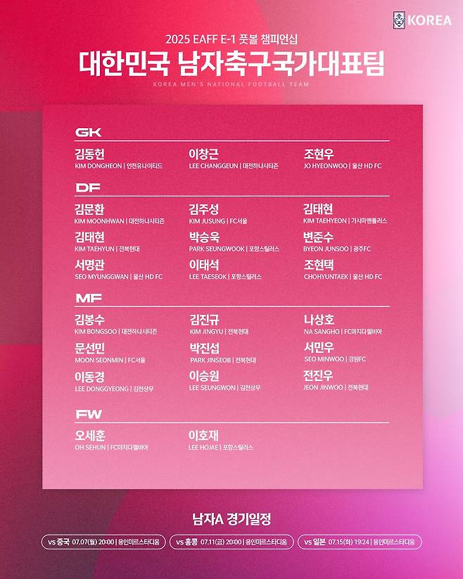 [골닷컴] 강동훈 기자 = 오는 7월 한국에서 개최되는 2025 동아시아축구연맹(EAFF) E-1 풋볼 챔피언십(동아시안컵)에 참가할 남녀 축구대표팀의 명단이 발표됐다. 동아시안컵은 오는 7월 7일부터 16일까지 경기도 3개 도시(용인, 수원, 화성)에서 개최된다. 남자부는 용인미르스타디움에서, 여자부는 수원월드컵경기장, 화성종합경기타운에서 열린다.