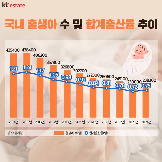 혼인 건수 또한 증가세를 보이고 있습니다. 통계청에 따르면, 우리나라 혼인 건수는 2022년 19만2000명에서 2023년 19만4000명, 그리고 2024년에는 22만2000명으로 증가했는데요. 코로나19 팬데믹 동안 미뤄졌던 혼인이 최근 들어 늘어나고 있고, 여기에 혼인 부부들이 아이를 낳기 시작하면서 출생아 수가 소폭 증가한 것으로 분석됩니다.