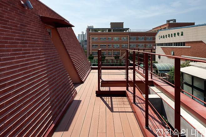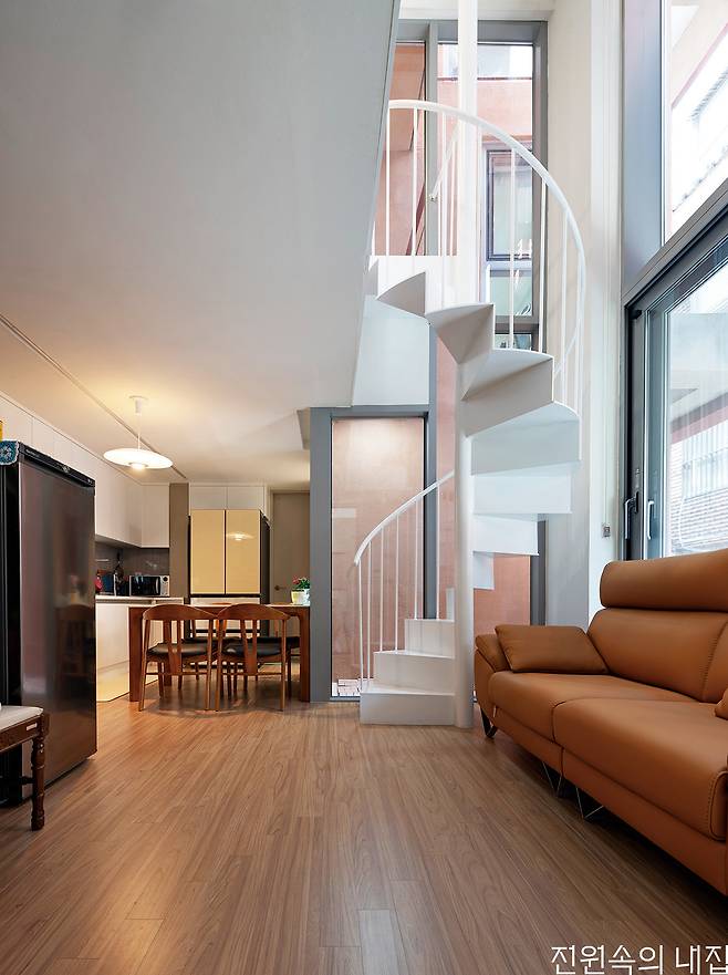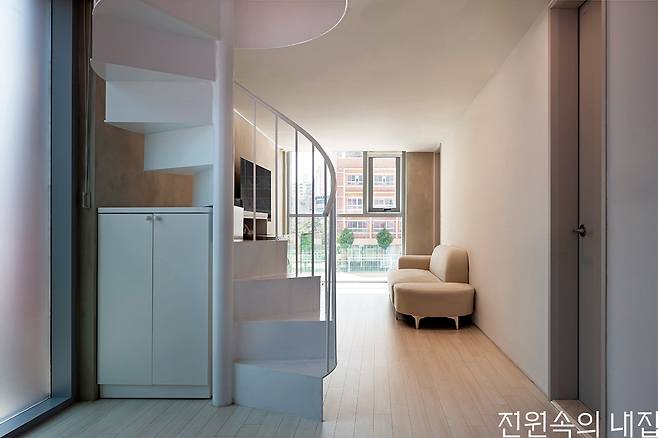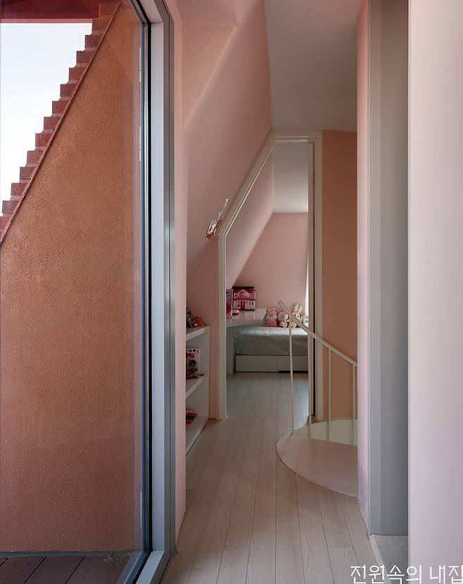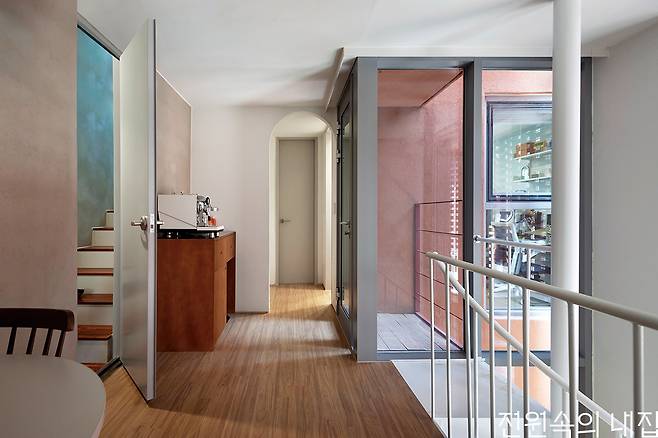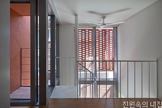 집 한가운데, 영롱 쌓기의 켜와 맞닿은 곳에 자그마한 중정을 두었다. 이를 기준으로 한쪽으로는 개인의 공간을 다른 한쪽으로는 가족의 공간을 쌓아 올린다. 각 공간은 벌어진 틈을 향해 숨을 내쉬면서도 구성원 간의 시선이 겹치지 않도록 (혹은 겹치도록) 영역마다 그 높이와 위치를 조금씩 조정한다. 공용 공간은 영롱 쌓기의 켜를 정면으로 마주하면서, 개인 공간은 켜를 측면에서 비스듬히 마주한다. 영롱 쌓기의 벽돌은 그 두께로 인해 투과율을 달리하는데 덕분에 거실에서는 아른아른 보이는 이웃의 풍경이 침실에서는 온전히 차단되고 중정과 켜 사이의 공간으로 반사되는 부드러운 햇살만 남게 된다.