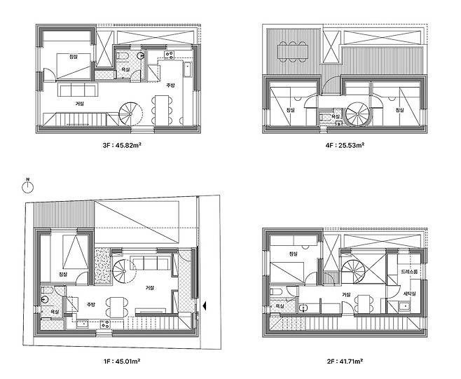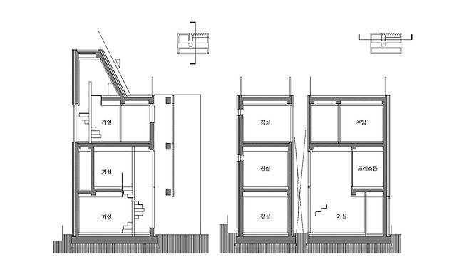 집이라 하면 육면체에 박공지붕을 얹은 오각의 단면을 떠올리듯, 협소주택이라 하면 정북일조 함수(y=2X, 단 y≦9일 때 x=1.5)가 만들어낸 그래프의 형상을 먼저 떠올리게 된다. 한 치의 공간도 아쉬운 협소주택이라면, 제도가 만들어낸 오롯한 형상에서 무엇인가를 덜어 내기란 쉽지 않은 일이다. 게다가 대지가 위치한 곳은 60~70년대에 형성된 주택가 골목의 끝자락이다. 이웃들은 정북일조 함수의 이격거리조차 확보하지 못한 채 서로 바짝 맞대고 서 있다. 이러한 환경을 딛고, 한 대가족이 가족 구성원 안에서 그리고 이웃과의 관계 안에서 어떠한 자세를 취해야 하는 것인가를 고민해야 한다.