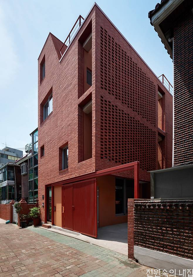 주택가 골목 안 작은 터에 자리를 내린 가족이 있다. 부모의 사랑을 한껏 누리며 자란 자식은 성인이 되고 부모가 되어, ‘삼대’라는 가족으로 다시 이 터에 모였다. 협소주택을 짓고자 하는 사람들이 대부분 젊은 부부나 싱글인 것을 감안하면, 자그마치 일곱 식구의 주택 생활은 조금 더 본질적인 ‘협소’주택이 된다. 대가족 안에서 가족 구성원 간의 긴장은 주택을 세분화하고 협소화한다. 한정된 공간 안에서 생활하는 각 구성원의 심리적 필요 영역은 물리적 공간으로 구획된다. 개개인의 버블을 한데 모아 정북일조의 함수 안에 밀어 넣고, 분류하고 압축하여 빈틈없이 차곡차곡 채워 담는다. 집 가운데를 관통하는 중정과 슬래브를 오픈하여 만든 높은 층고의 공간조차도 사실은 ‘비워냄’을 꾹꾹 눌러 채워 담은 것일지도 모른다.주변의 이웃들은 거리낌 없이 사방으로 창을 냈다. 나중에 들어선 집들은 어쩔 수 없이 창마다 차면시설을 덮는 와중에도 집안에는 햇살이 머물기를 바란다. 대지의 남쪽은 옆집과 바짝 붙어있어 깊은 우물처럼 햇살이 전혀 들지 못한다. 거기에 차면시설까지 덧씌워야 할 터이니 기능을 하지 못하는 창이 된다. 오히려 옆집과 얼마간의 이격이 가능한 북측으로 창을 내고, 서너 발짝 물러난 바깥으로 벽돌을 엇갈려 쌓아 올려 이웃과 내 가족 사이에 한 켜의 필터를 만든다. 내 집의 입면은 이웃의 창밖 풍경이기도 하기에, 부드럽게 벽돌로 모자이크 처리된 시선으로 서로의 관계를 다독여본다.