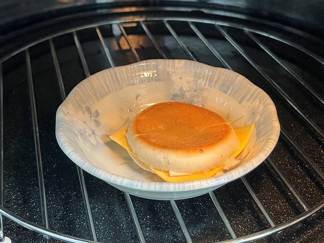 전자레인지에 살짝 데워주면 꿀호떡 샌드위치가 완성됩니다. 치즈도 살짝 녹고 꿀호떡도 따끈하게 데워집니다.