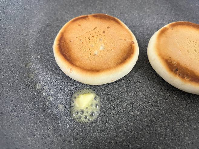 꿀호떡은 그냥 팬에 구워도 맛있지만, 버터를 곁들여 구워주면 또 다른 풍미가 납니다.
