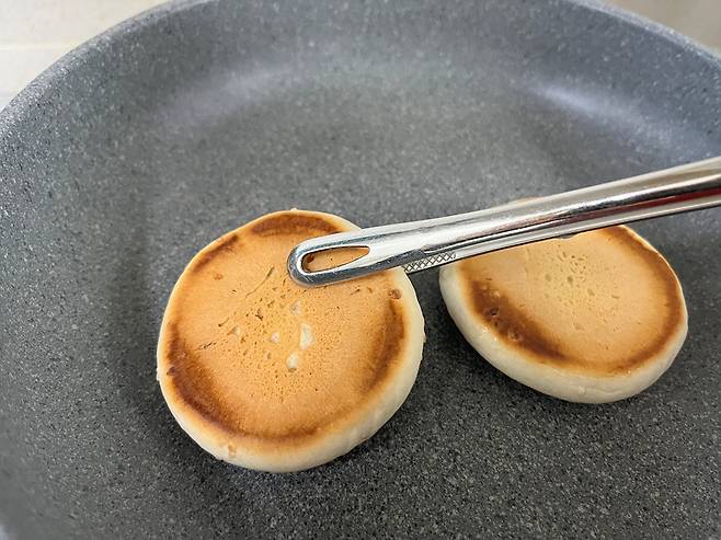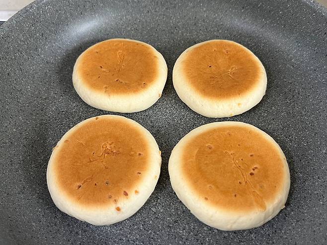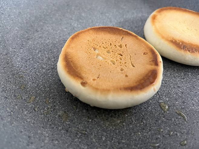 프라이팬을 약불에 달군 후 꿀호떡을 올려서 은은하게 구워 보세요. 기름을 두르지 않고 구우면 담백한 맛을 즐길 수 있어요.