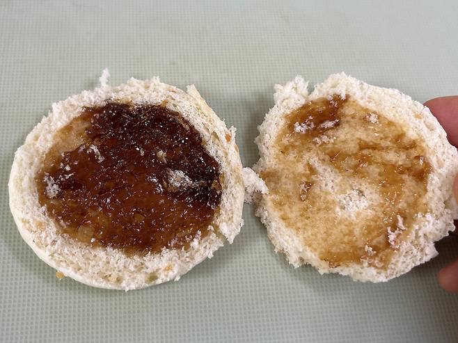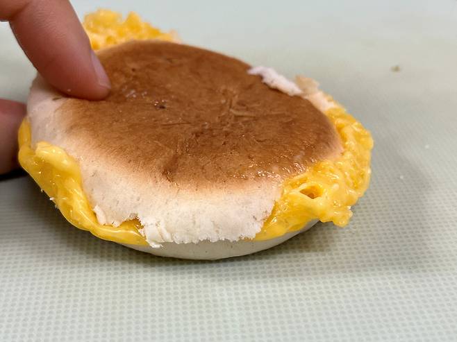 꿀호떡을 반으로 갈라 보세요. 안쪽에 원하는 재료를 넣어 샌드위치 형식으로 만들 수 있습니다.