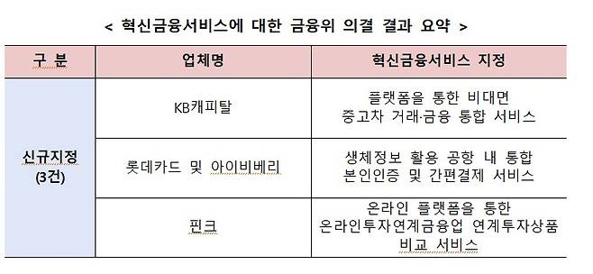 신규 지정된 KB캐피탈의 '플랫폼을 통한 비대면 중고차 통합 서비스'는 차량 구매상담부터 금융 통합상담 및 계약체결까지 한 번에 가능하도록 하는 서비스이다. 여신금융업법상 캐피탈사는 부수업무로 자동차 매매와 통신판매중개업을 할 수 없지만 이번에 규제 특례가 적용된 것이다.