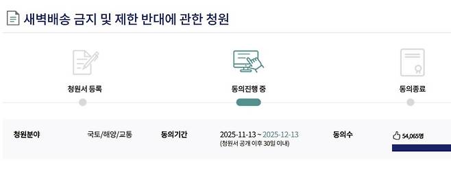 자신을 맞벌이 가정 주부라고 밝힌 한 청원인은 지난 달 13일 "저녁 늦게 귀가하는 맞벌이 부모에게 새벽 배송은 단순한 편의가 아니라, 일상을 지탱하는 중요한 수단"이라며 "무작정 금지하는 것은 더 큰 불편과 사회적 갈등을 가져올 뿐"이라고 밝혔다.
