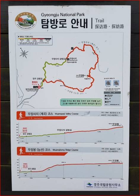 → 암곡탐방지원센터→ 암곡 갈림길→ 무장사지 계곡코스(완만한 길)→ 억새군락지→ 무장봉(해발 624m)→ 무장봉 능선코스(가파른 길)→ 원점회귀