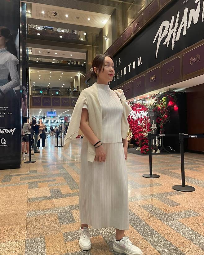 공연장 로비에서 임정희는 아이보리 컬러의 니트 원피스와 어깨에 가볍게 두른 가디건, 화이트 스니커즈로 모던하고 세련된 미니멀룩을 완성하고 있다. 전체적으로 톤온톤 스타일링이 고급스러운 분위기를 자아내며, 실용성과 우아함을 동시에 보여준다.