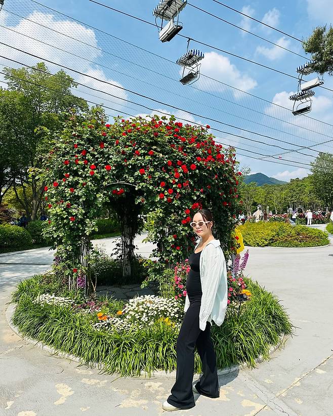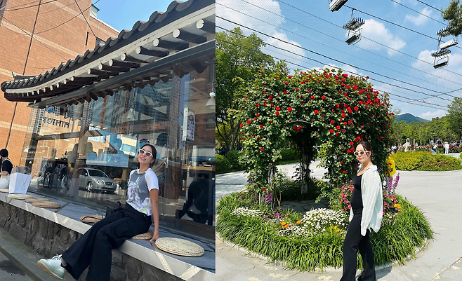 장미 정원에서 임정희는 블랙 슬리브리스와 블랙 플레어 팬츠, 그리고 화이트 셔츠를 걸쳐 산뜻하면서도 여성스러운 무드를 연출하고 있다. 자연스러운 헤어와 미니멀한 액세서리가 꽃과 어우러져 로맨틱한 감성을 더한다.