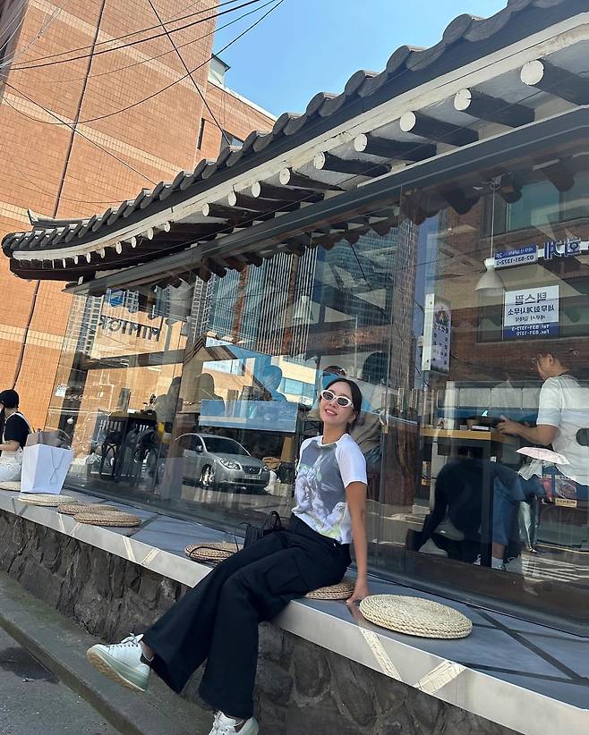 도심 한옥 카페 앞에서 임정희는 프린팅 티셔츠와 블랙 와이드 카고 팬츠, 화이트 스니커즈를 착용해 캐주얼하면서도 트렌디한 스트리트 패션을 선보이고 있다. 실용적인 팬츠와 심플한 티셔츠 조합이 자유로운 분위기를 자아낸다.