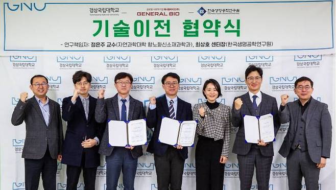 경상국립대(GNU·총장 권순기) 산학협력단(부총장 겸 산학협력단장 정재우)과 제너럴바이오㈜(대표이사 서정훈, 정석근), 한국생명공학연구원(원장 김장성)은 지난 9일 가좌캠퍼스 산학협력단 기술비즈니스센터 회의실에서 기술이전 계약을 체결했다.