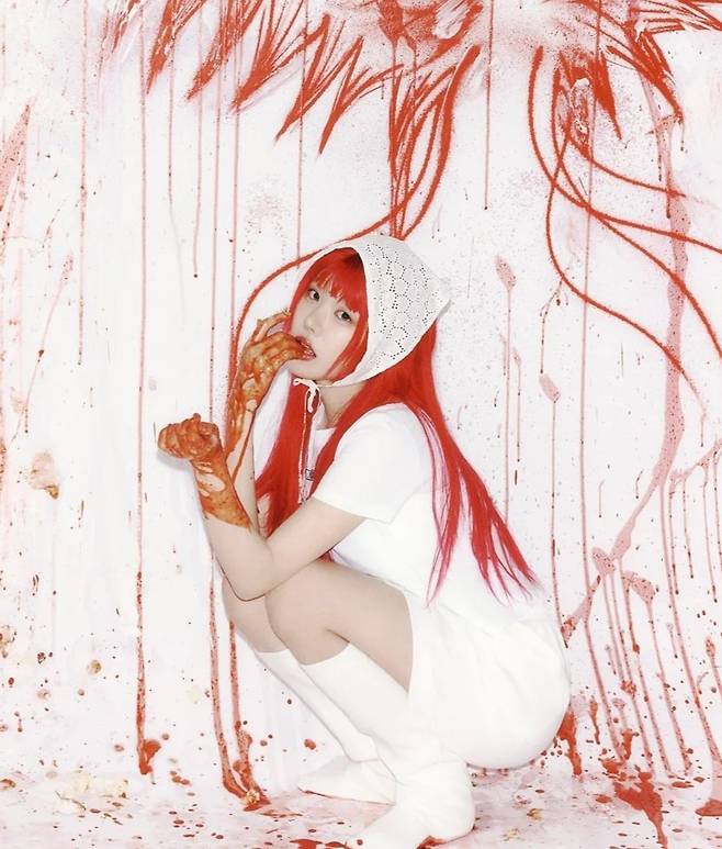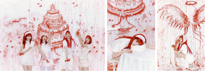 반면 Blossom 버전은 흰색과 빨간색이 어우러지는 색감, 케이크와 잼을 오브제로 한 컨셉입니다. 순수한 느낌을 주는 흰색의 배경과 의상과는 다르게, 벽을 타고 흐르는 빨간색의 잼은 약간 섬뜩한 느낌을 주기도 하는데요. 그러나 "피어나다"라는 뜻을 가진 Blossom과 퍼지는 물감, 색감이 연결되며 키워드를 잘 설명하고 있는 것 같았습니다.