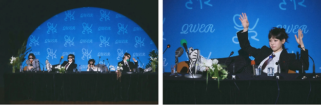 Algorithm 버전은 파란 배경의 기자 회견장을 컨셉으로 하고 있습니다. 사진 속 QWER은 오버핏 수트와 선글라스, 운동화 등으로 껄렁한 모습을 보여주고 있는데요. 특히 테이블 위로 다리를 올리거나, 턱을 괴고 있는 등 기자 회견과는 맞지 않는 행동이 반항아스러운 모습을 구현하고 있는 듯했습니다.
