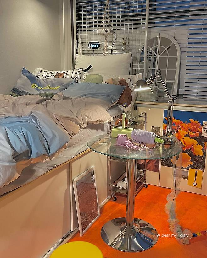 유니크한 인테리어를 원하시는 분들 여기 집중해 주세요. 쨍한 컬러의 카펫 위 스틸 소재의 테이블 거기다 미적 감각을 더해주는 아트 포스터까지!🎨 컬러풀한 아트 피스들이 모인 뉴욕 미술관이 생각나는 건 저 뿐만이 아니겠죠? 특히 포스터로 된 그림은 교체하기도 쉽고 여백이 있는 공간에 무심코 세워두기만 해도 인테리어 효과가 짱짱하니 공간 꾸미기 초보인 분들께 강추👍