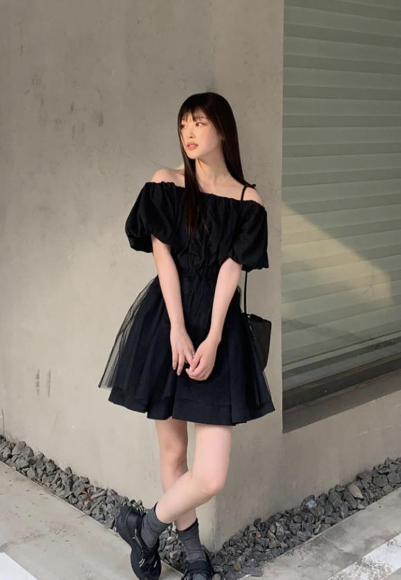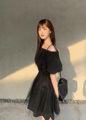 자카드 폴리 소재를 활용해 고급스러운 질감과 가벼운 착용감을 동시에 구현했으며, 오프숄더 퍼프 디자인이 볼륨감 있는 실루엣을 완성한다.