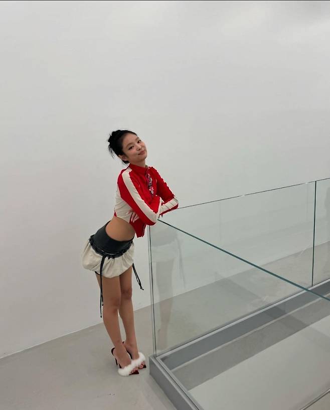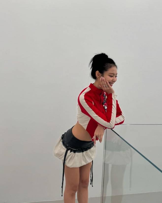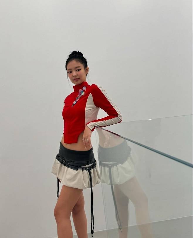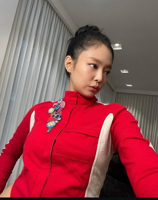 제니는 레드 크롭 집업을 착용해 강렬하고 매력적인 분위기를 연출했습니다.