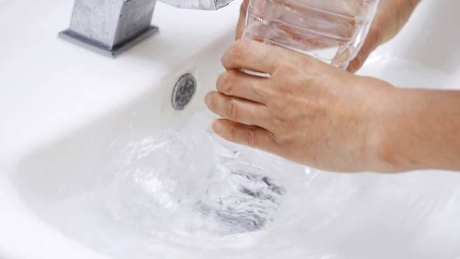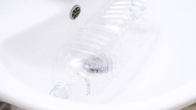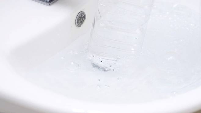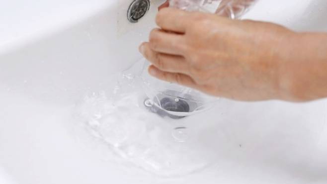 그리고 물을 충분히 받은 후 페트병 주둥이를 배수구에 꽂아 주세요.