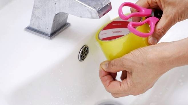 먼저 세면대를 보면 물이 빠질 수 있도록 상단에 구멍이 하나가 있는데요. 테이프를 이용해 이 구멍을 막아 주세요.