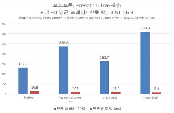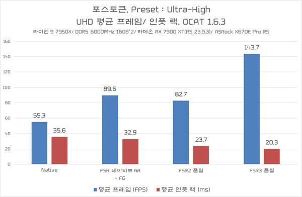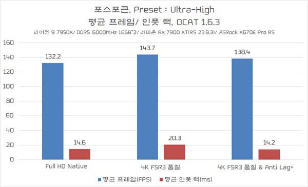 참고로, 다음 결과는 게임 내장 벤치마크를 진행하는 동안 AMD가 FSR3 지원을 위해 업데이트한 OCAT 1.6.3 버전을 이용해 게임 초반의 평균 프레임과 인풋 랙을 측정한 것으로, 평균 성능 자체는 게임내 벤치마크의 최종 점수와 차이가 있을 수 있다.