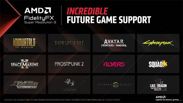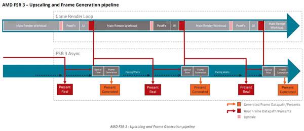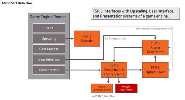 FSR3에 적용된 업스케일링 기술 자체는 FSR2을 기반으로 하며, 여기에 프레임 생성 기술이 결합된 것이 핵심이다. 업스케일링 자체는 FSR2에 기반하기에, AMD는 기존 FSR2 지원 타이틀은 손쉽게 FSR3 구현할 수 있다고 말하고 있다.