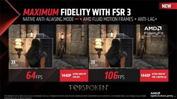 하지만 이미지의 디테일을 중시하는 게이머라면 FSR3의 프레임 생성은 아쉬울 수 있는 기술이다. 위 1:1 크롭 이미지를 비교하면 프레임 생성이 포함된 '네이티브 AA + FG' 화면과 FSR3 화면이 비교군인 네이티브 해상도 및 FSR2 보다 블러 필터를 적용한 것처럼 흐릿한 모습이고, FSR2에서는 놓치지 않던 건물의 창틀 디테일이 FSR3에서는 순간적으로 사라지는 현상도 관측되었다.
