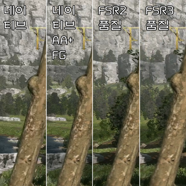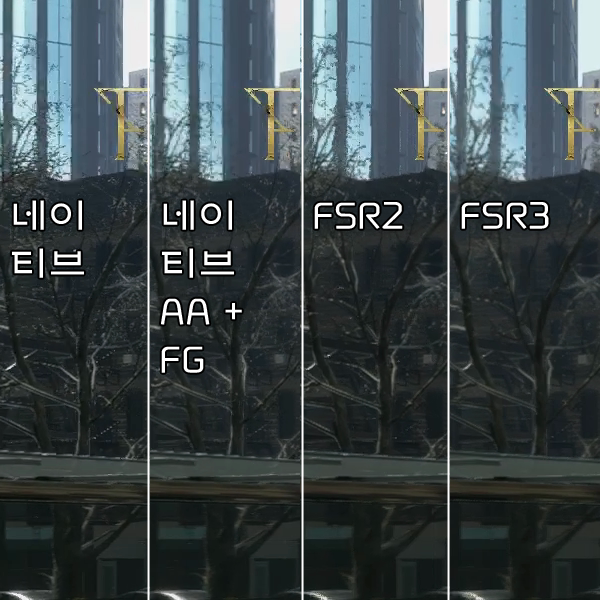 이후 네이티브 해상도일 때, 네이티브 AA에 프레임 생성을 더했을 때 결과물을 비교했다.