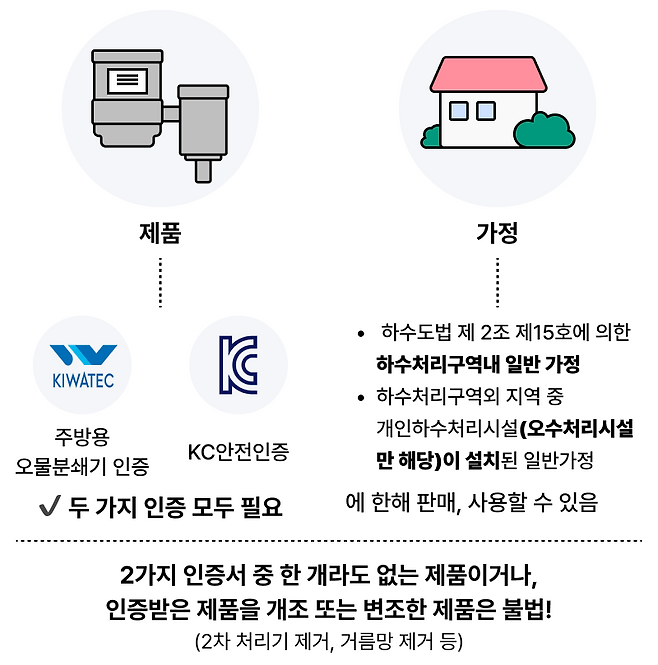 오물분쇄기는 한국물기술인증원에서 하수도법 기준에 따른 인증을 받지 않으면 판매할 수 없습니다. 또한 2차 처리기(회수부)가 없거나 처리기 내에 거름망이 없어 갈린 음식물이 100% 배출되는 제품은 인증에 상관없이 불법입니다.