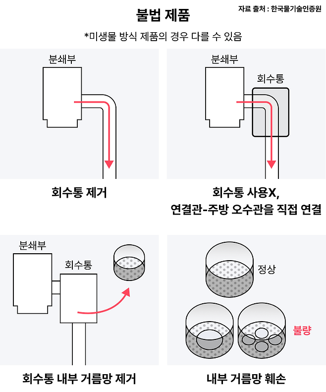 이런 제품들은 '음식물 쓰레기 집 밖으로 가져나갈 필요 없어요', '싱크대 에서 한 번에 처리 끝' 등의 문구로 소비자를 현혹시키는데, 불법 제품을 구매하지 않으려면 반드시 주의해야 합니다.