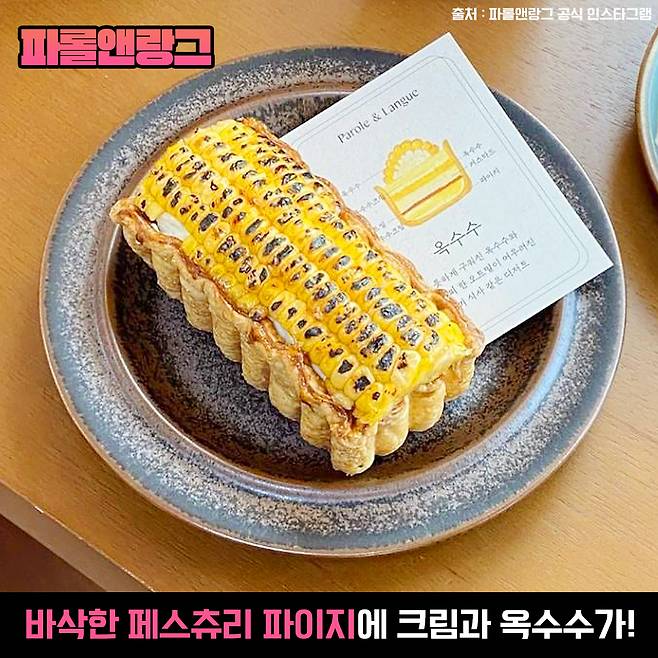 SNS에서 핫플레이스로 유명한 파이 전문점이죠! 파롤앤랑그 옥수수는 바삭한 페스츄리 파이지와 크림과 과일이 겹겹이 쌓여서 만들어진 파이입니다.