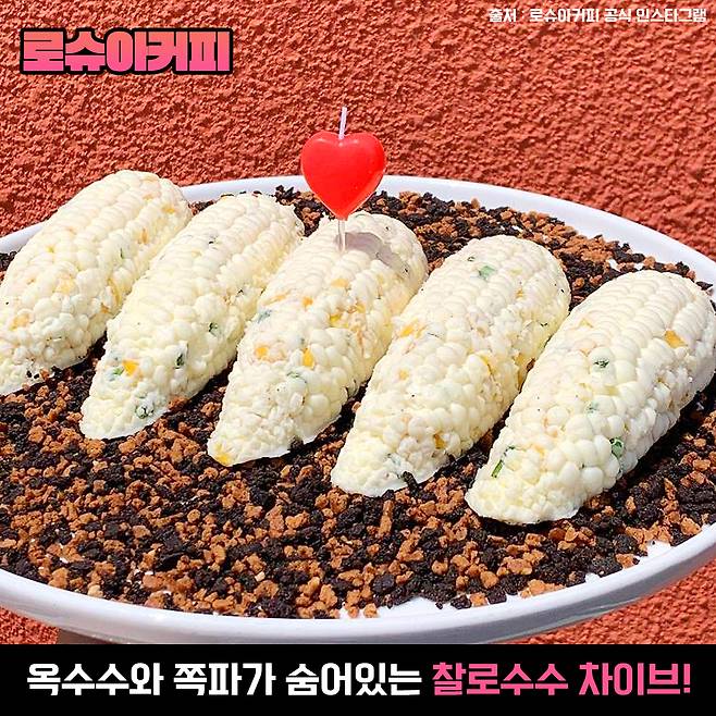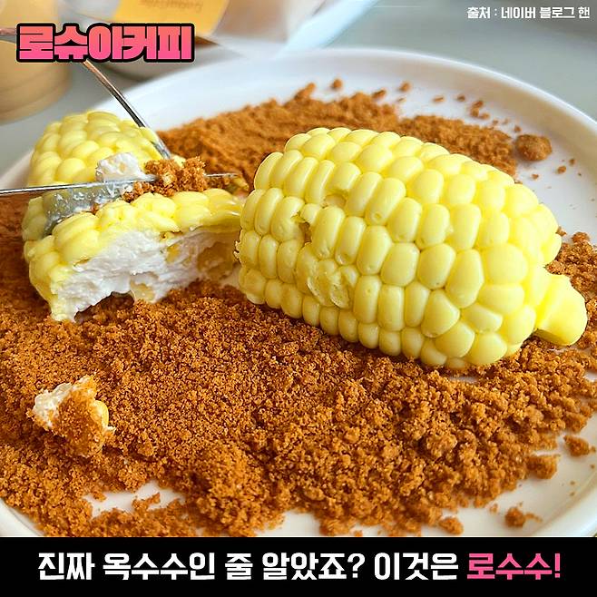 “진짜 이거 찐 옥수수 아니야?”라는 생각을 들게 만드는 로슈아 커피의 시그니처 메뉴 로수수입니다. 딱 사진만 봤을 때 진짜 껍질 벗겨놓은 옥수수 같지 않나요?
