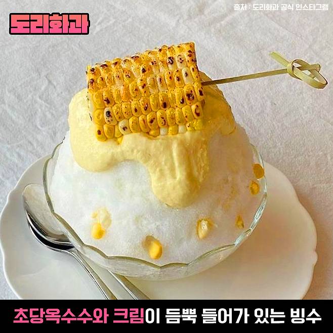 초당옥수수 크림이 듬뿍 들어가 있는 시즌 한정 빙수! 이 또한 시즌이 지나서 내년에 먹어야 하는 아쉬움이 있네요ㅠㅠ흑 살짝 구워진 초당옥수수와 그 밑에는 보기만 해도 달달한 초당옥수수 크림이 안쪽에도 가득한 것이 특징이에요~