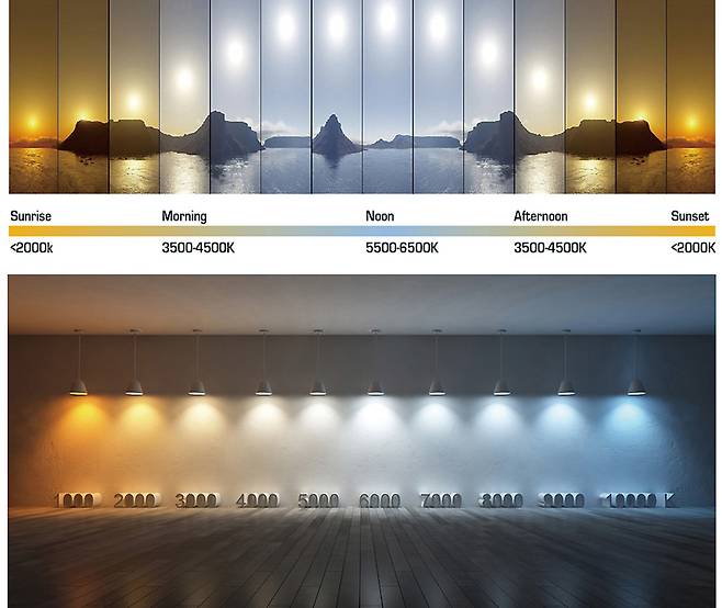 한낮의 태양광을 보면 눈부시게 밝기도 하지만, 빛이 ‘쨍하다’고 느껴진다. 이때의 색온도는 6,000~6,500K으로 ‘주광색’이라 한다. 한자로 ‘낮 주(晝)’자를 써서 주광색이다. 한낮의 태양빛이라는 의미로 사용하는데, 형광등이 주로 이 주광색으로 생산되어 널리 쓰였다. 한국에서는 많이 사용하지는 않지만, 전구색 형광등도 있다. 밝은 흰색으로 언뜻 푸른 빛깔이 도는 느낌이다. 태양빛을 반사하는 달빛의 색온도가 밤에 보면 차갑게 느껴지는 것도 달의 색온도가 높기 때문이다. 색온도가 낮으면 따뜻한 오렌지 빛으로, 색온도가 높으면 희다 못해 푸른 빛으로 느껴진다. 전구색과 주광색 사이, 4,000~5,000K 정도의 색온도 조명을 ‘주백색’이라고 하는데, 주광색에 비하면 부드러운 흰 빛의 조명이다.