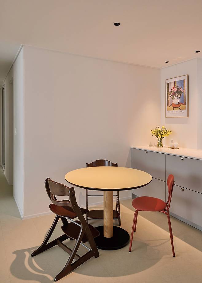 색온도는 취향의 문제이기 때문이다. 그리고 자주 강조하지만, 조명은 빛의 문화이기에 반드시 어떠해야 한다는 것은 없다. 다만 ‘보다 바람직한 방향’이라는 면에서 설명하자면, 주거공간이라면 기본적으로 휴식을 위한 공간 인상이 우선되어야 하기에 전구색의 낮은 색온도의 광원으로 통일하여 공부방, 거실, 침실, 식탁과 주방으로 계획하는 것을 추천한다. 공부방 색상의 긴장도 유지는 책상 스탠드와 같은 국부조명 배광으로 조율할 수 있기 때문이다. 전구색으로만 조명을 설치해 누렇게 보이면 어떻게 하냐는 건축주도 있었다. 하지만 완성된 후에는 아늑하고 편안하며 쾌적하다고 모두 만족했다.