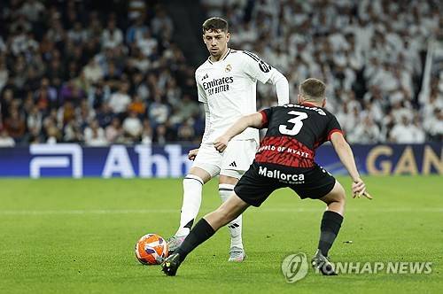 epa12100623 Real Madrid's Fede Valverde (L) in action against RCD Mallorca's Toni Lato during the Spanish LaLiga soccer match between Real Madrid and Real Mallorca, in Madrid, Spain, 14 May 2025. EPA/Chema Moya