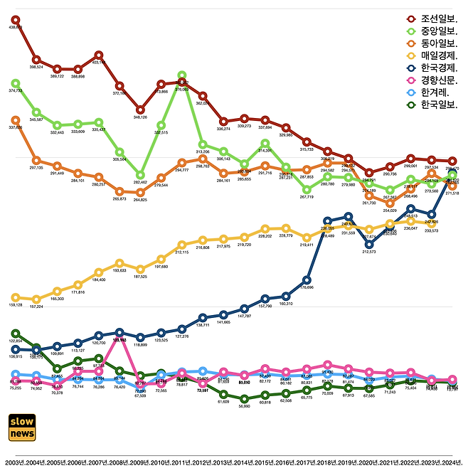 - 조중동의 지난해 매출은 각각 2965억 원과 2822억 원, 2716억 원이다. 한국경제신문은 2023년 2428억 원에서 지난해 2846억 원으로 늘었다.