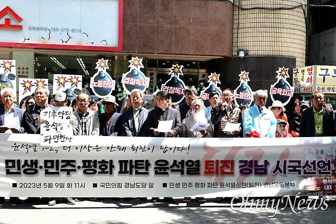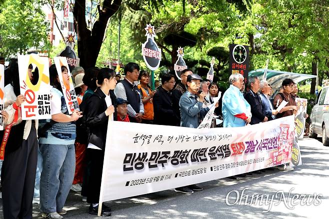 경남지역 시민사회·정당·종교계와 개인들이 경남 창원에 있는 국민의힘 경남도당 앞에서 이같이 외쳤다. 윤석열 대통령 취임 1년을 맞아 경남지역 205개 시민사회단체와 개별인사 334명이 시국선언을 한 것이다.