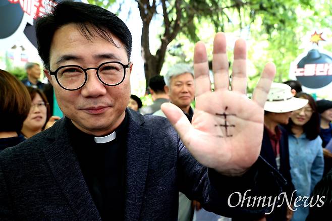 | ▲ 민생민주평화파탄 윤석열심판 경남운동본부는 9일 국민의힘 경남도당 앞에서 "윤석열 취임 1년에 즈음한 시민사회단체-각계인사 시국선언"을 했다. 천주교 백남해 신부가 손바닥에 '주(主)'를 써와 펼쳐보였다. |
